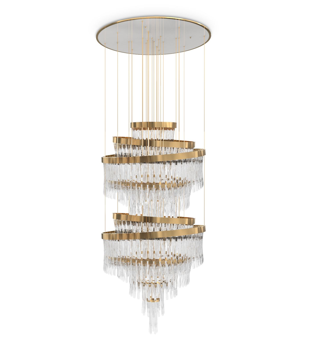Described as a masterpiece of design, the Babel Chandelier XL is the perfect centerpiece that will illuminate every setting perfectly. Shaped with a downfall of handmade crystal glass and gold-plated brass, it creates exclusive patterns of lighting reflecting on the surroundings.