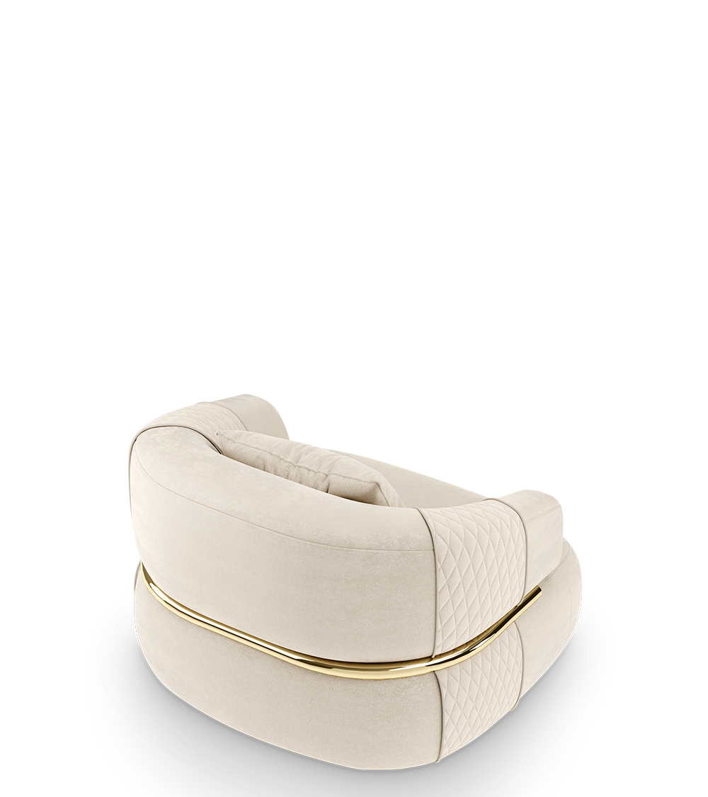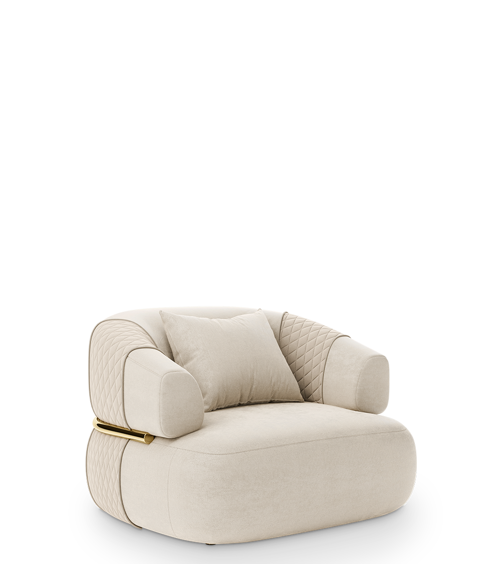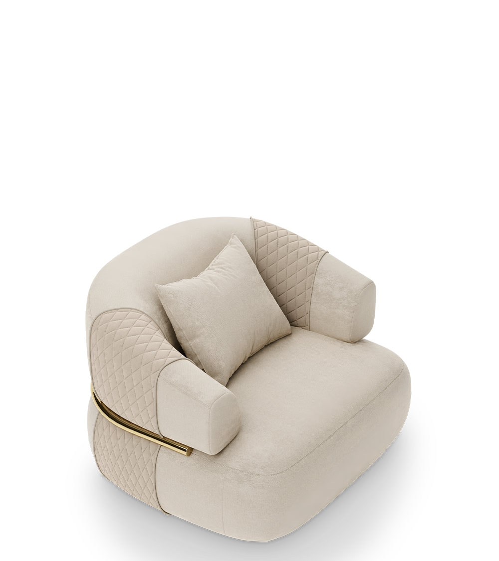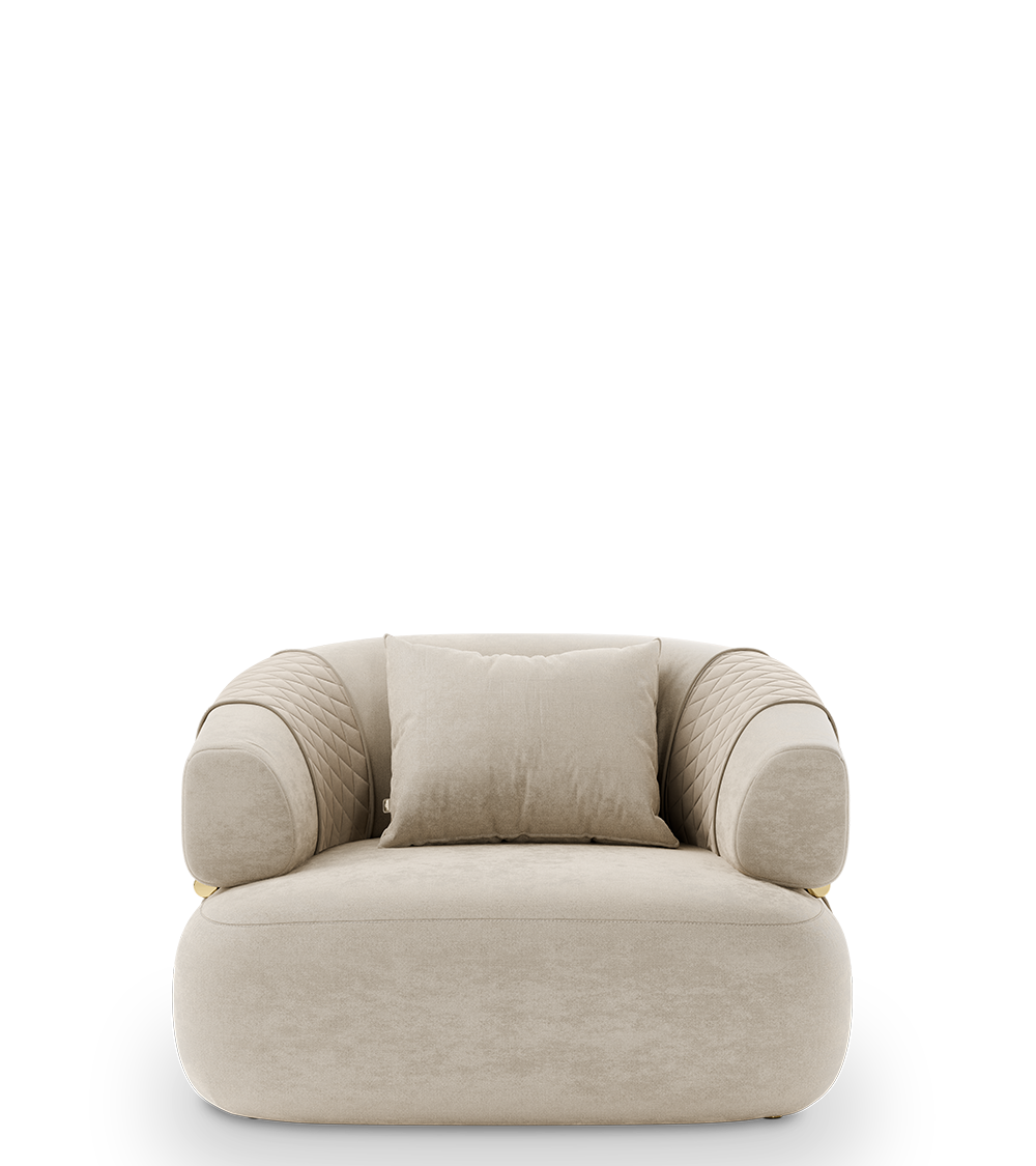 Reminiscent of the mid-century modern movement, the Bellamy armchair mirrors the sofa’s elegance but in a singular, sculptural form. It is covered in beige velvet and neosuede sand-toned fabric for visual appeal and utmost comfort. Quilted side detailing adds subtle texture, while a sleek metallic accent frames the back, lending a hint of luxury.