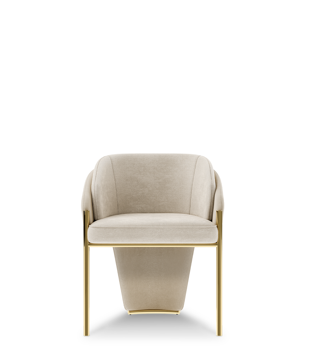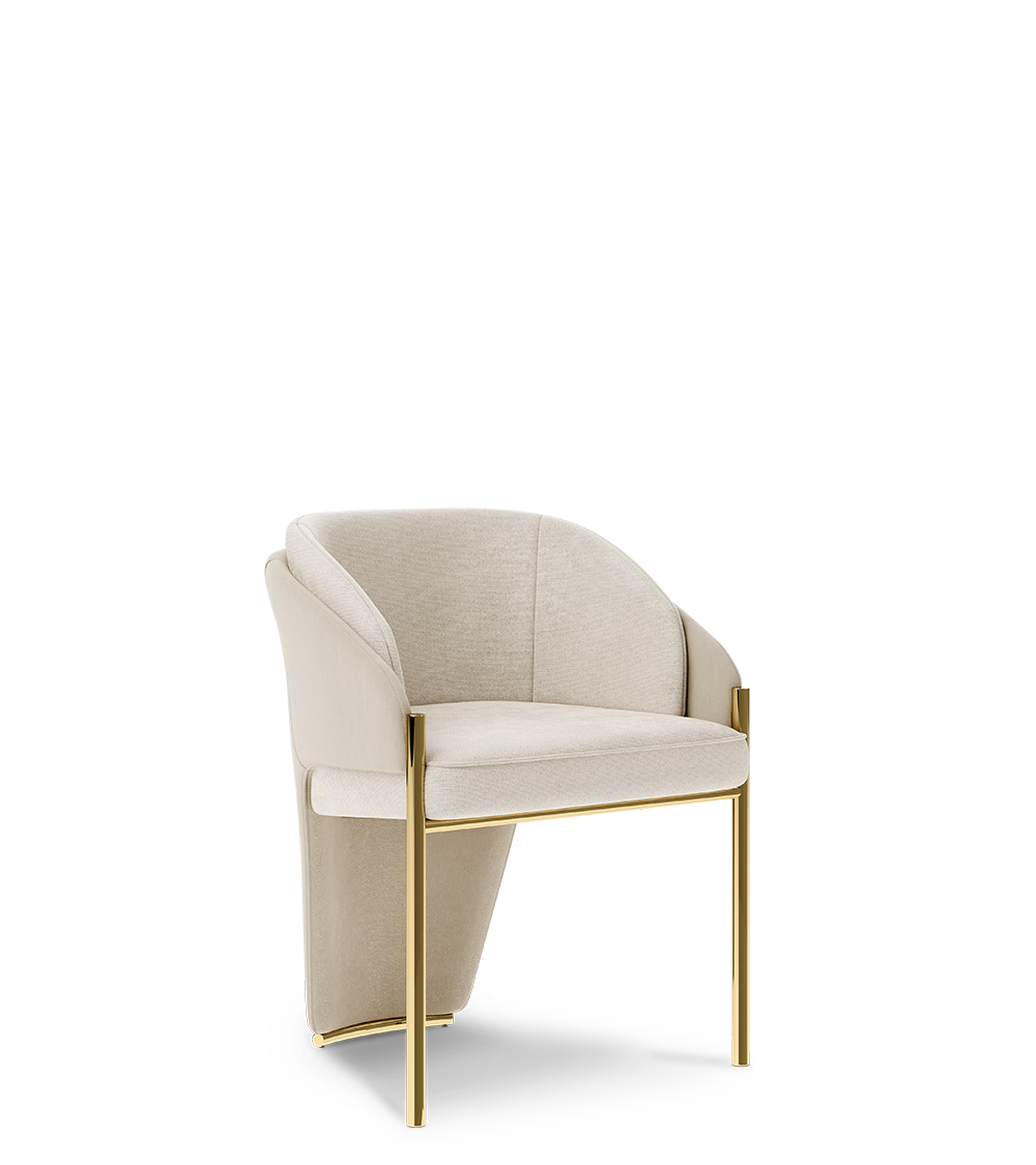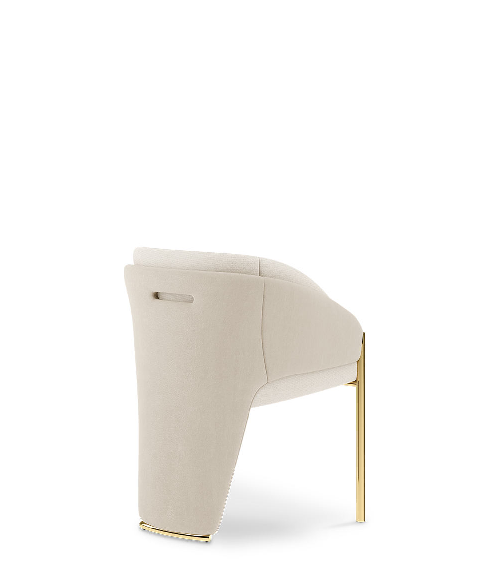 In Latin and Greek origins, Callis represents elegance and beauty; an entirely fitting name for such a classic dining chair. Graceful, bold, and feminine, the Callis dining chair gives a new perspective to neutral luxury. It is fully upholstered in soft grey fabric, framed with leather edging that extends to the floor. Its legs and contours are finished in brass, creating a striking contrast.