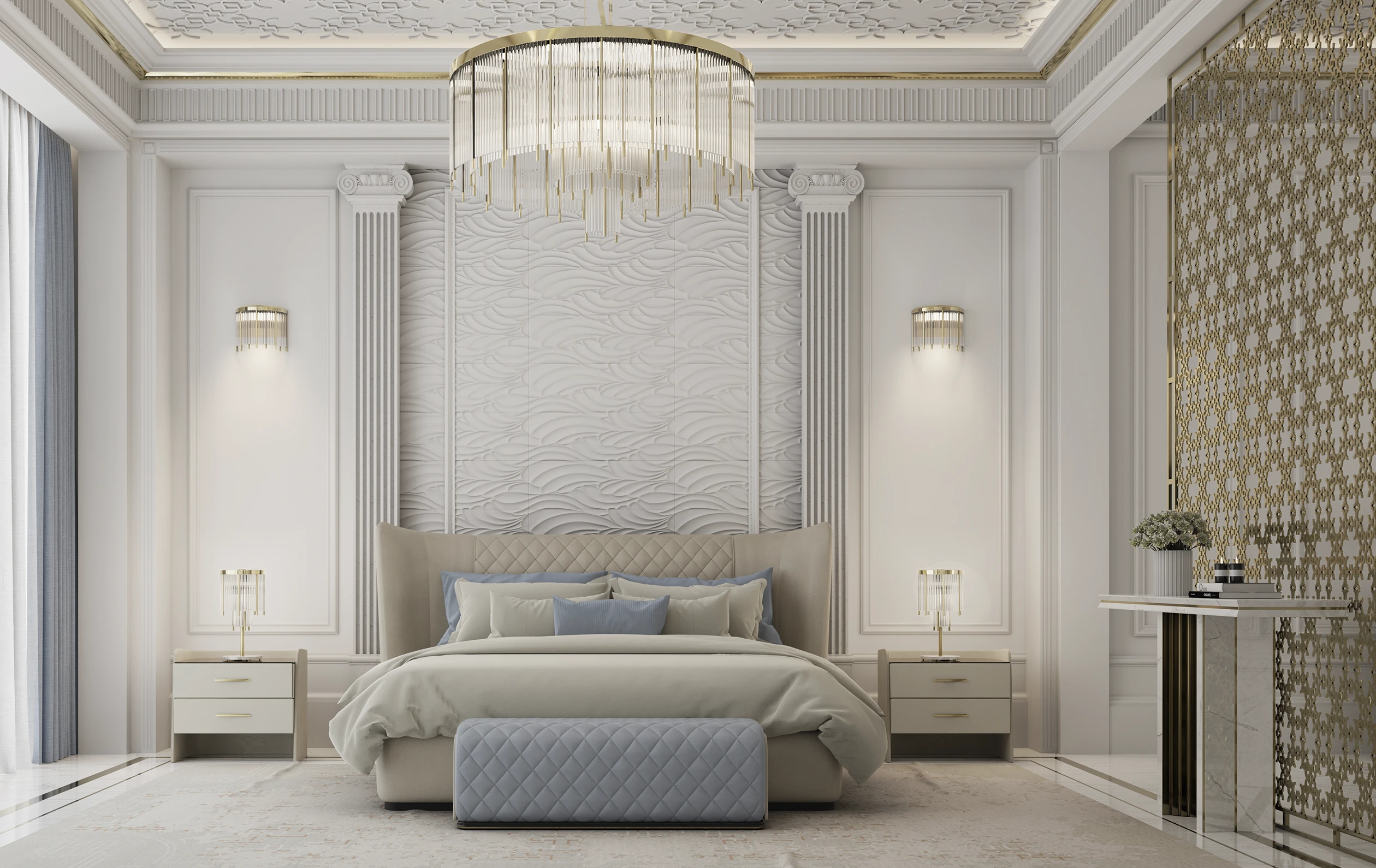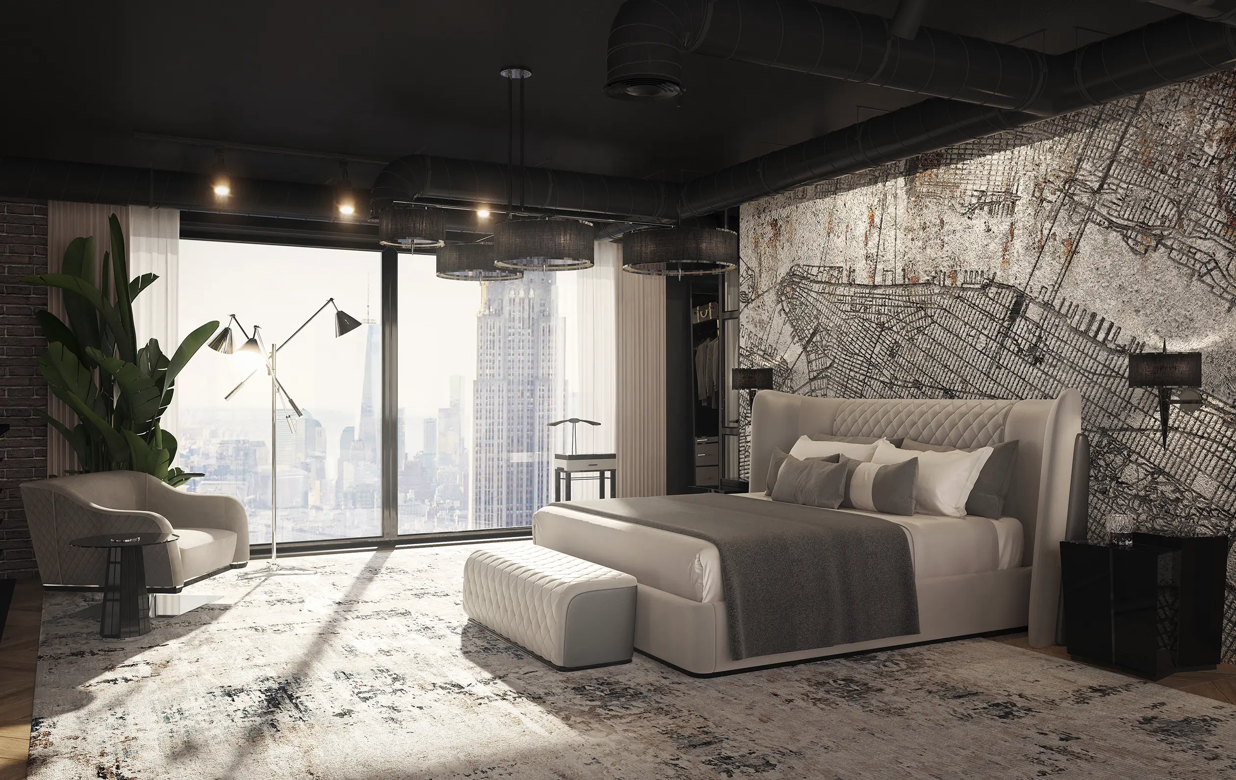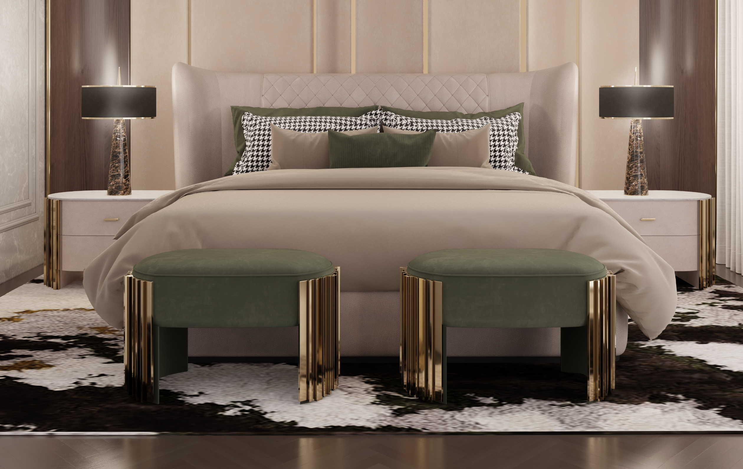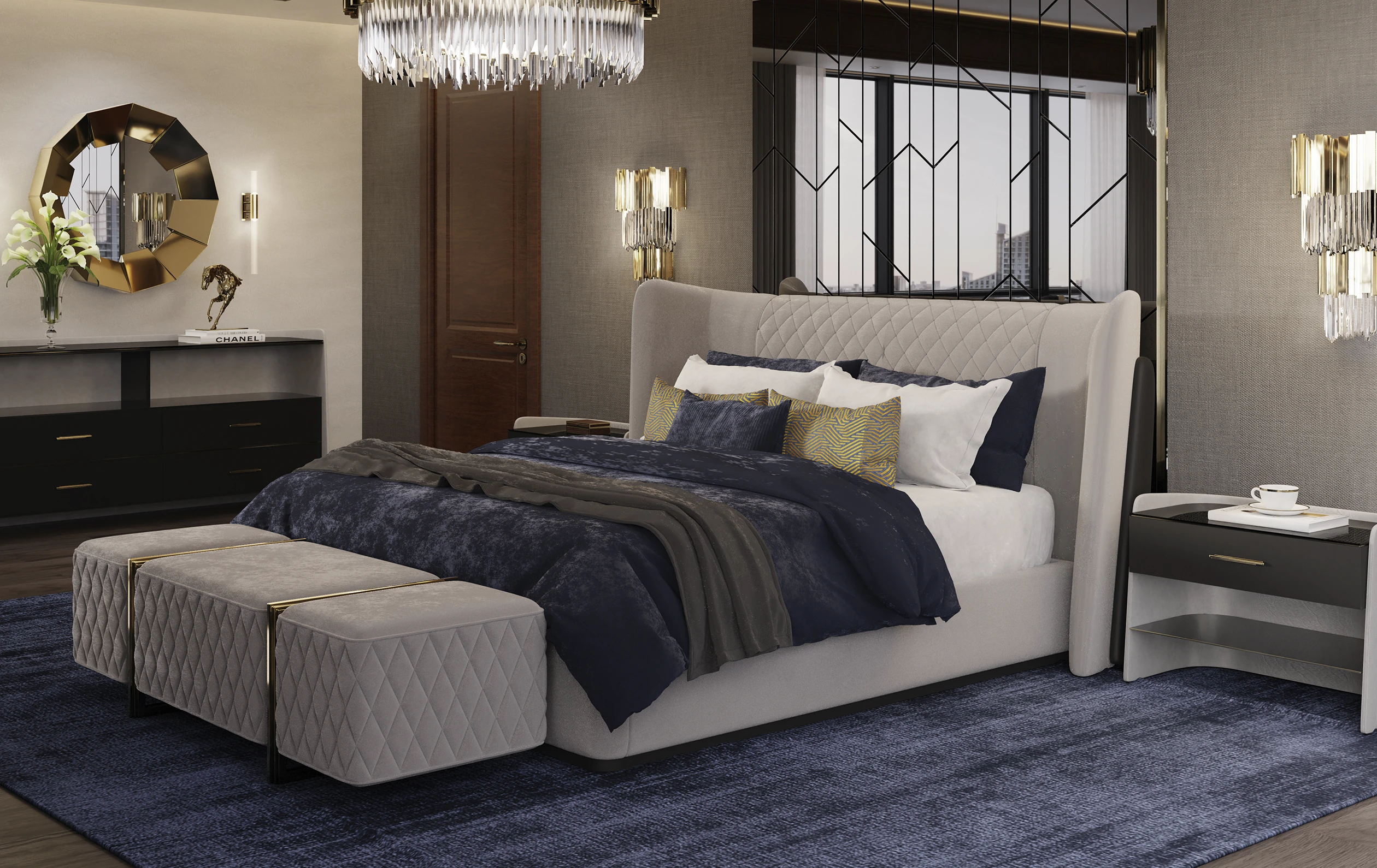 The Charla Bed instantly becomes the centerpiece of any bedroom decor, commanding attention with its impeccable craftsmanship and luxurious grey and black leather upholstery. Experience the allure of opulence and wake up in unrivaled luxury with this high-end bed.