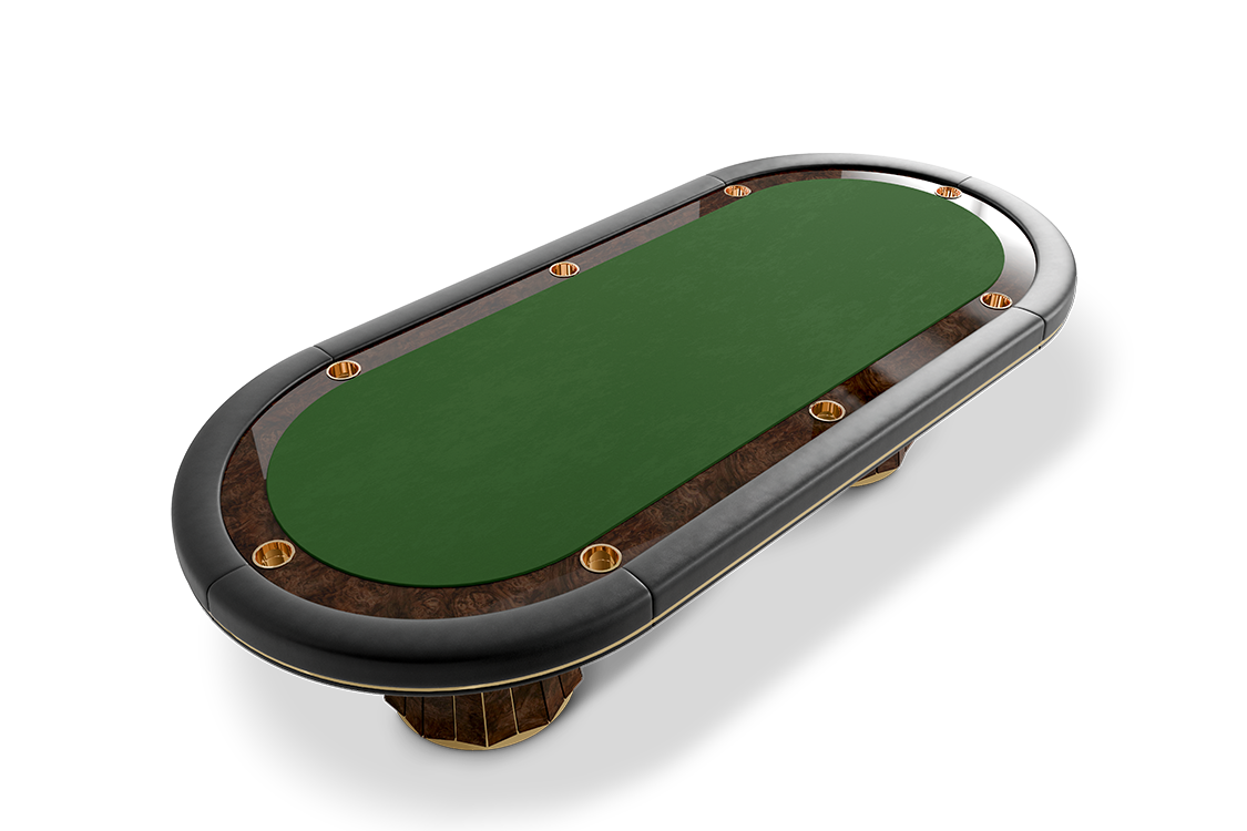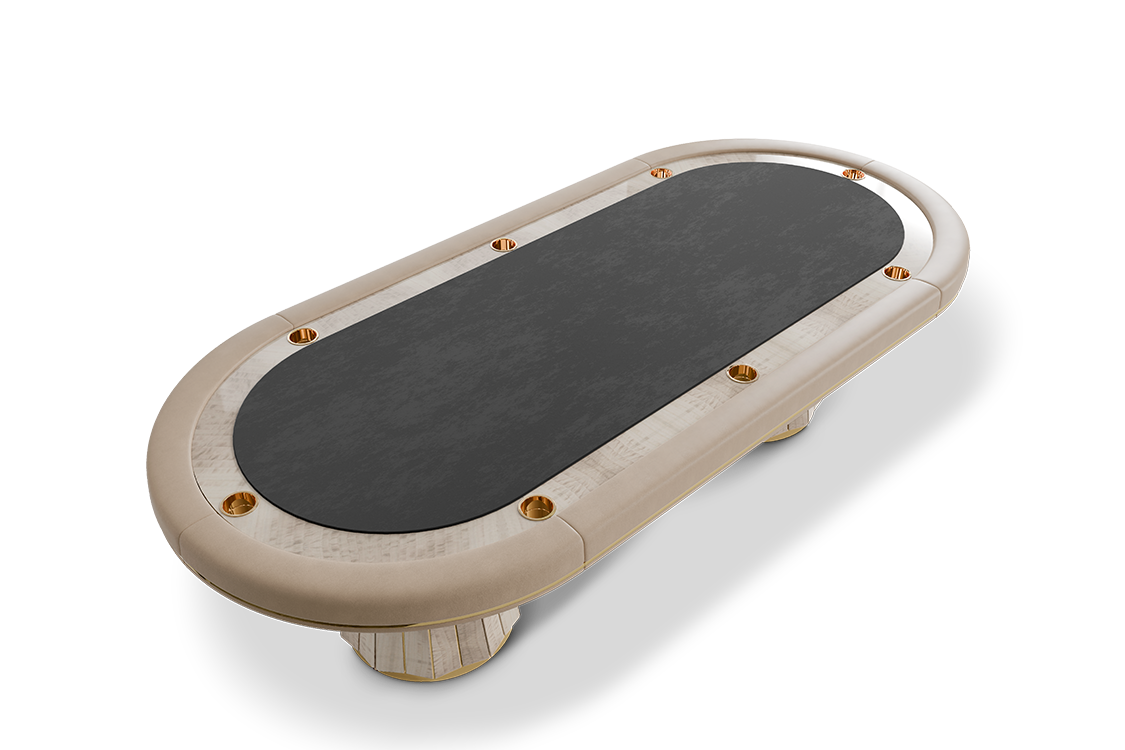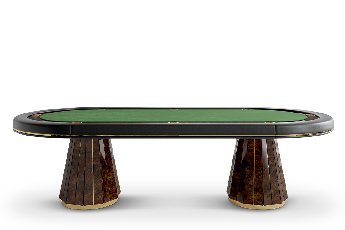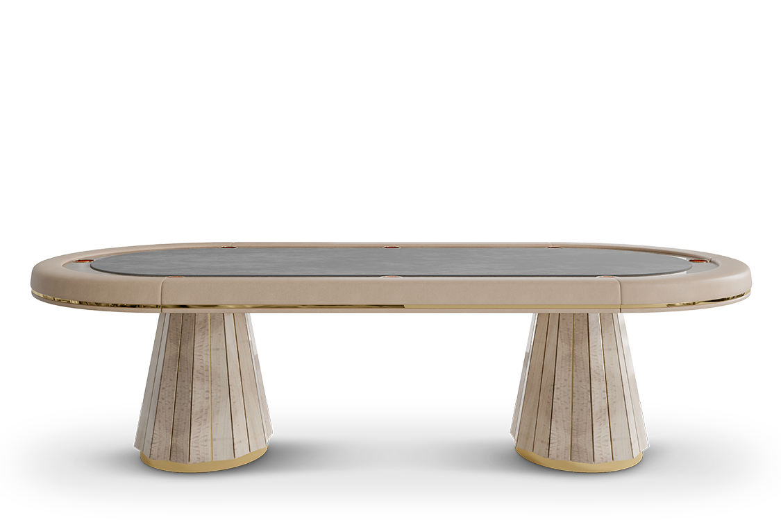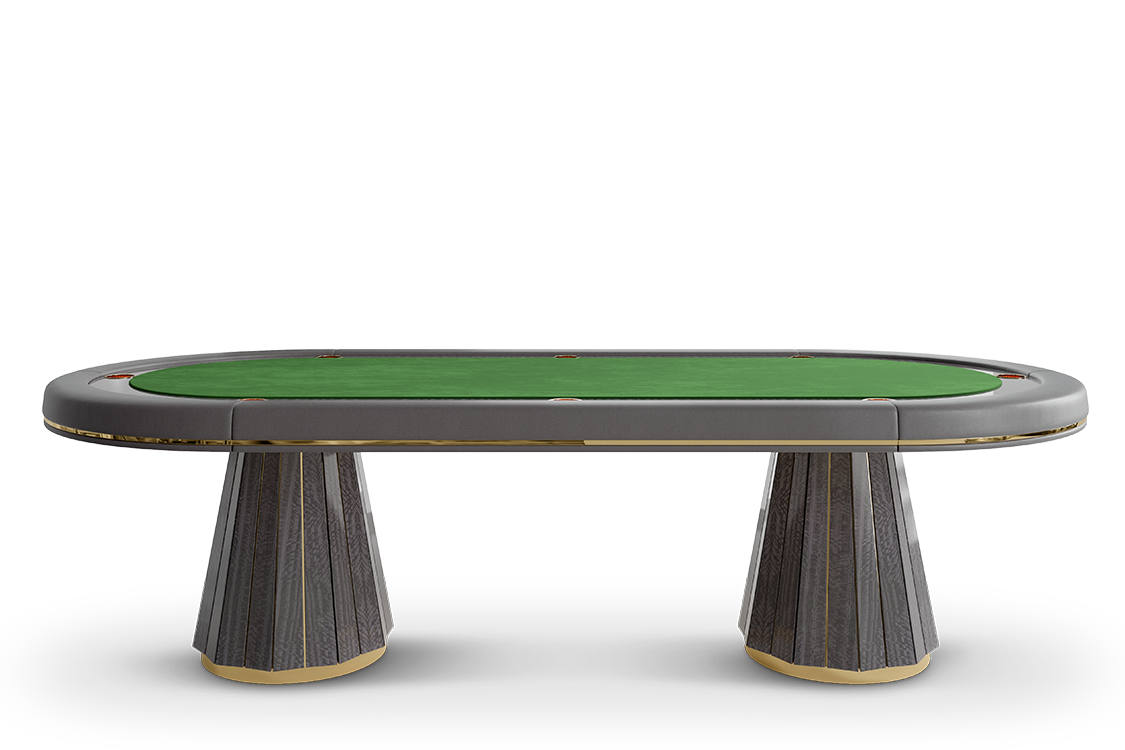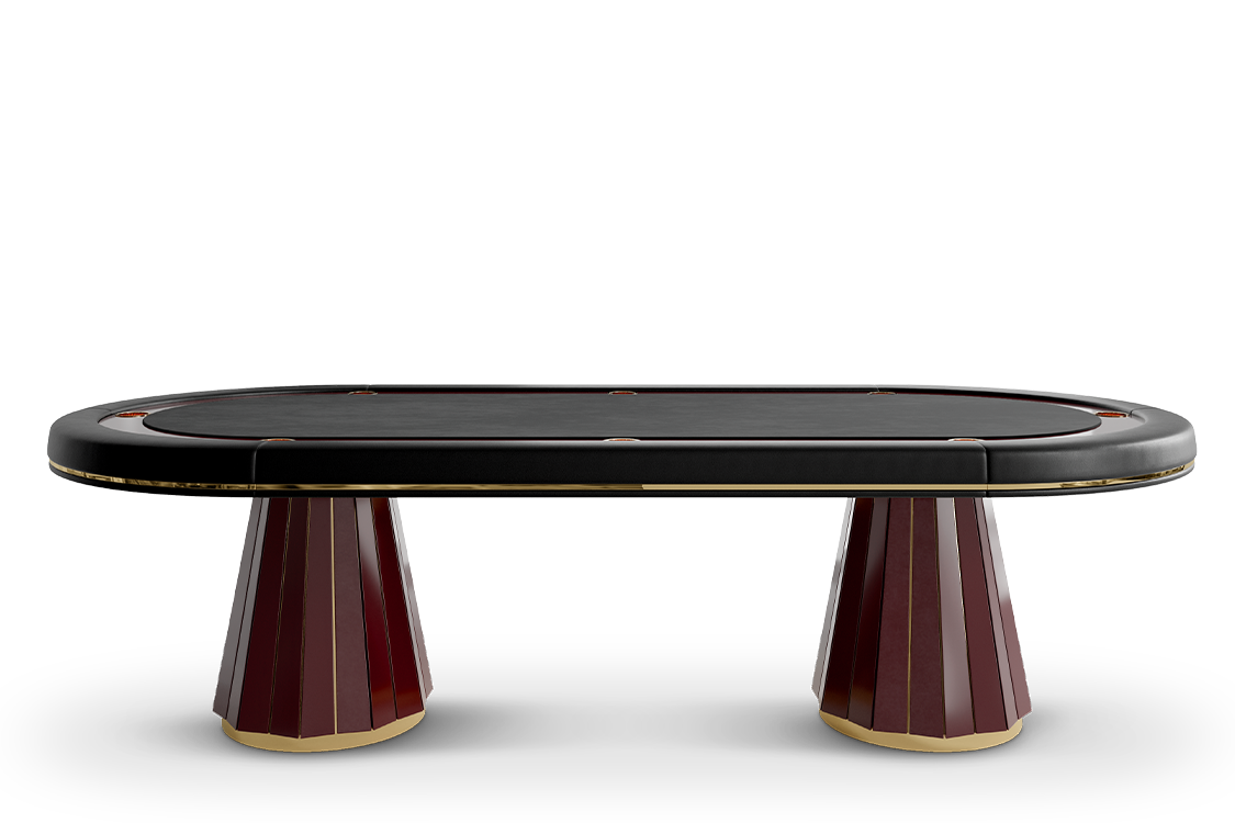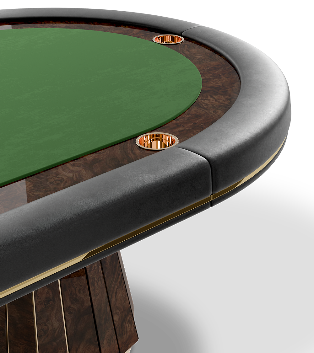 The Darian Oval poker table is a sturdy and refined solution for any entertainment or gaming environment. This exclusive design features an extensive structure that accommodates up to 8 players. It is a perfect design for a good old poker get-together. Its classic oval shape showcases phenomenal craftsmanship with a wooden build and sublime polished brass details.