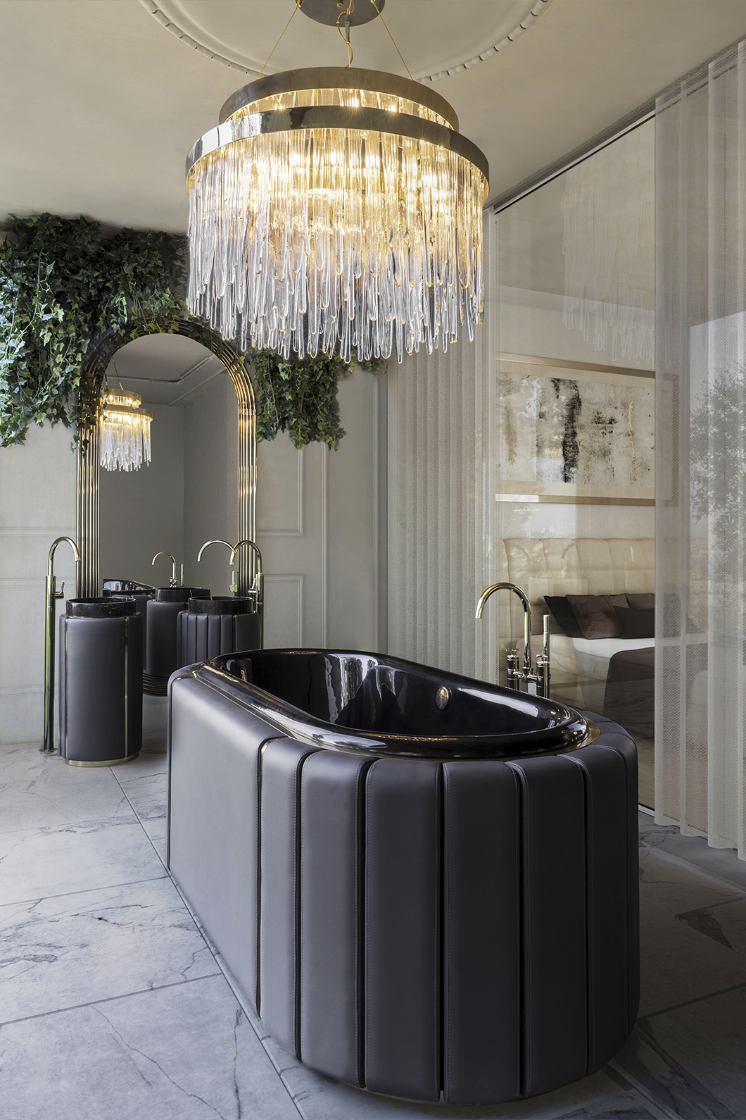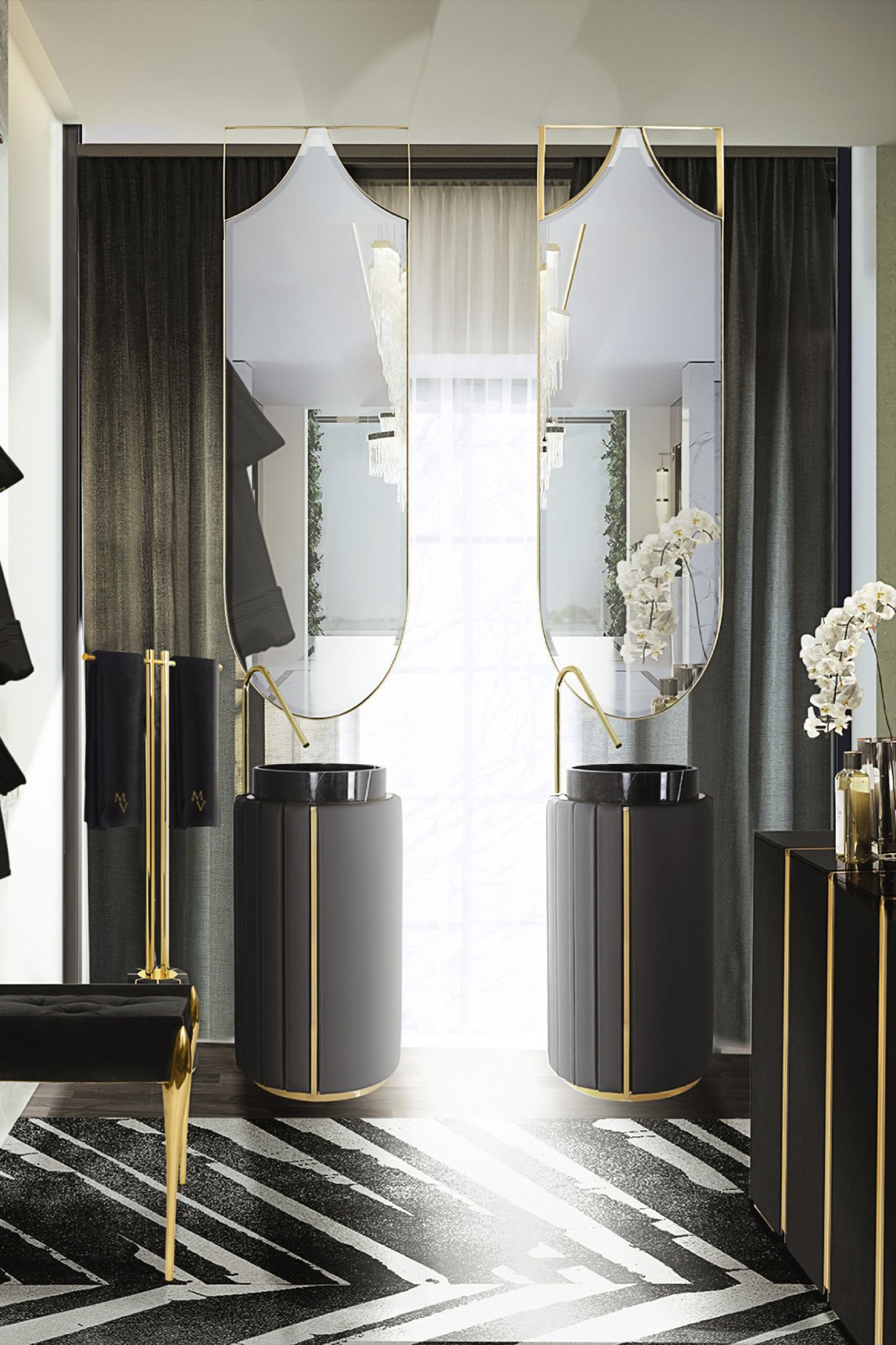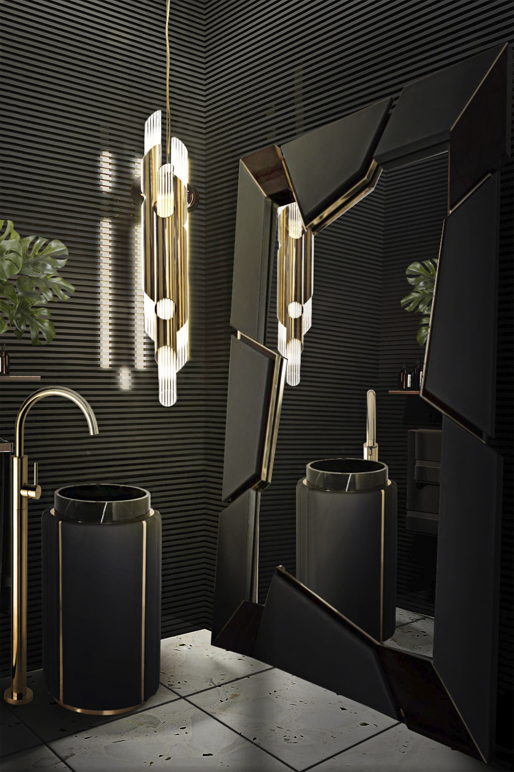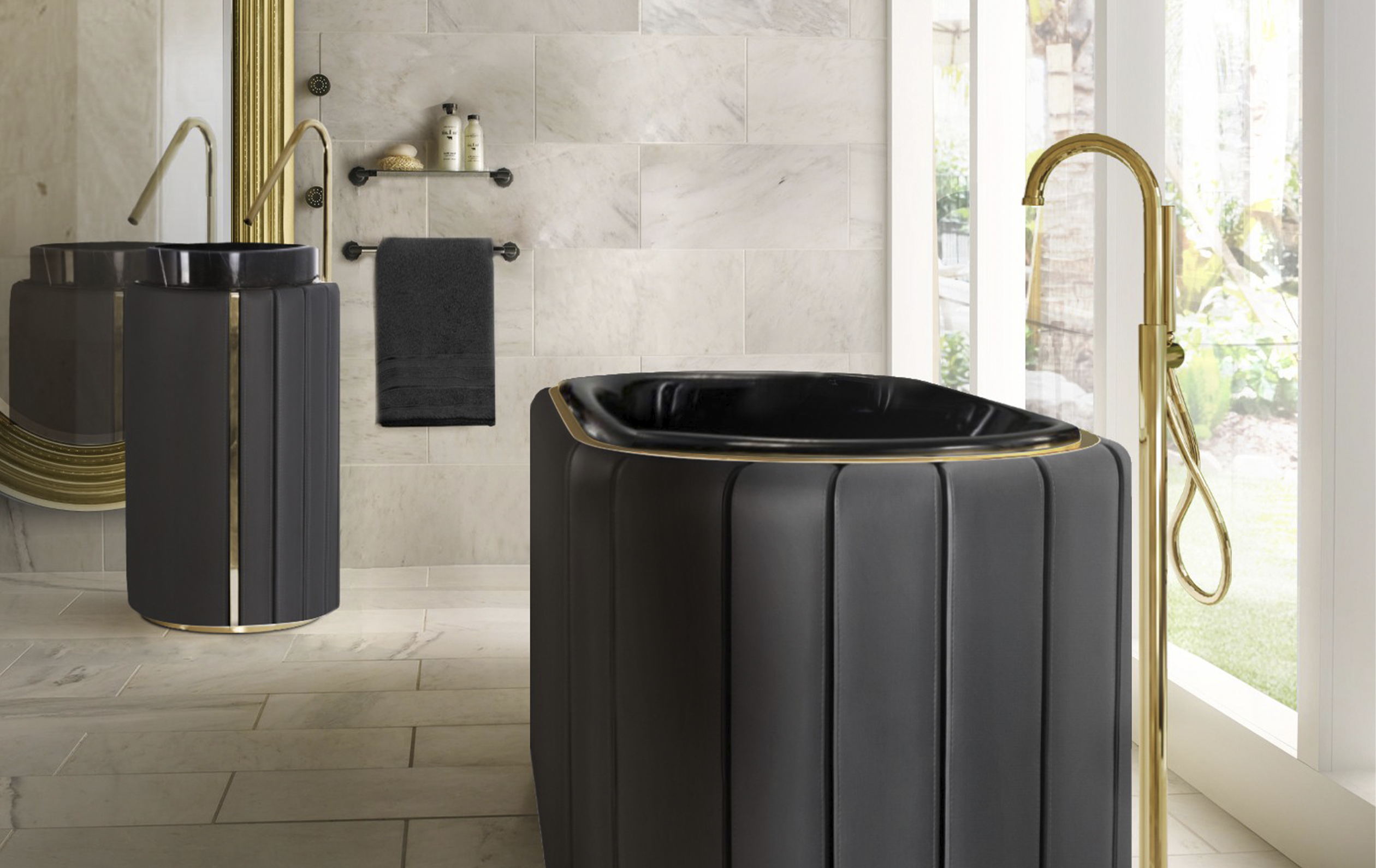 The Darian Pedestal Sink draws inspiration from Darius, the great Persian king. This modern freestanding sink is the result of a partnership between LUXXU and Maison Valentina, conceived with precise knowledge of production techniques and materials, from metalwork to upholstery. It features an amazingly dazzling cluster of asymmetrical gold-plated brass bars enveloping a black leather structure that will allow for great luxury in your bathroom design.