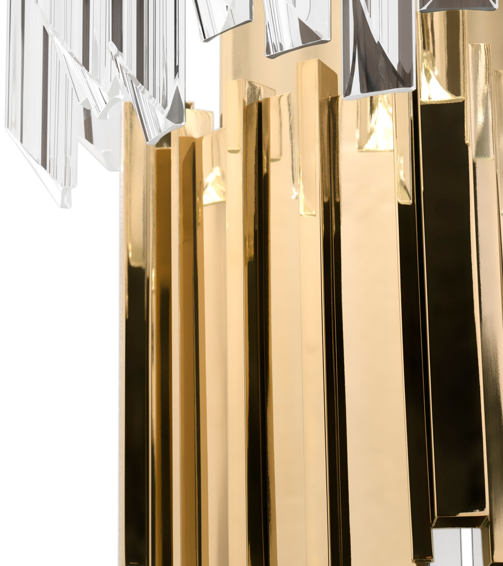 The Empire II Wall Lamp pays homage to the elegant and extravagant lines of the Empire collection, making it suitable for the most exquisite projects, whether residential or hospitality. This noble and sublime wall light is crafted from opulent layers of gold-plated brass and crystal glass, inspiring even more glamour and luxury in any interior decor.