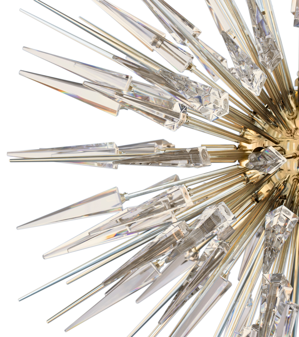 Explosion is a suspended lighting fixture that evokes the vast cosmos of modern design. This suspension lamp light has the iconic Sputnik design while casting a unique sense of luxury. The thin gold-plated brass and crystal arms that circle the center sphere reflect LUXXU's attention to detail.