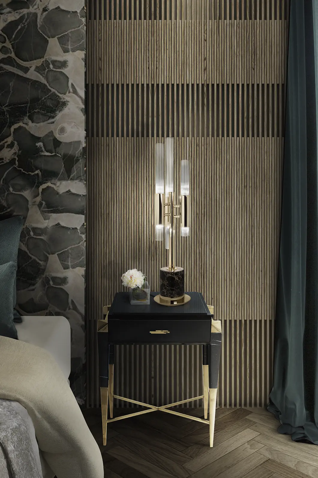 Inspired by ancient Rome, the Spear Side Table showcases a timeless design. Sleek, gold-plated lines gracefully support a square platform crafted from Nero Marquina marble. The base tapers dramatically, creating an intersecting boundary that adds to its allure. This side table embodies a harmonious blend of strength and elegance, making it the perfect complement to a mirrored surface.