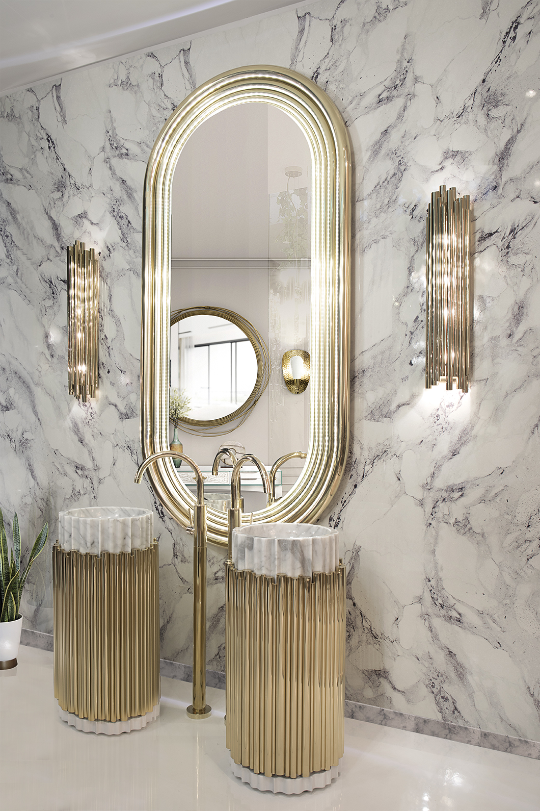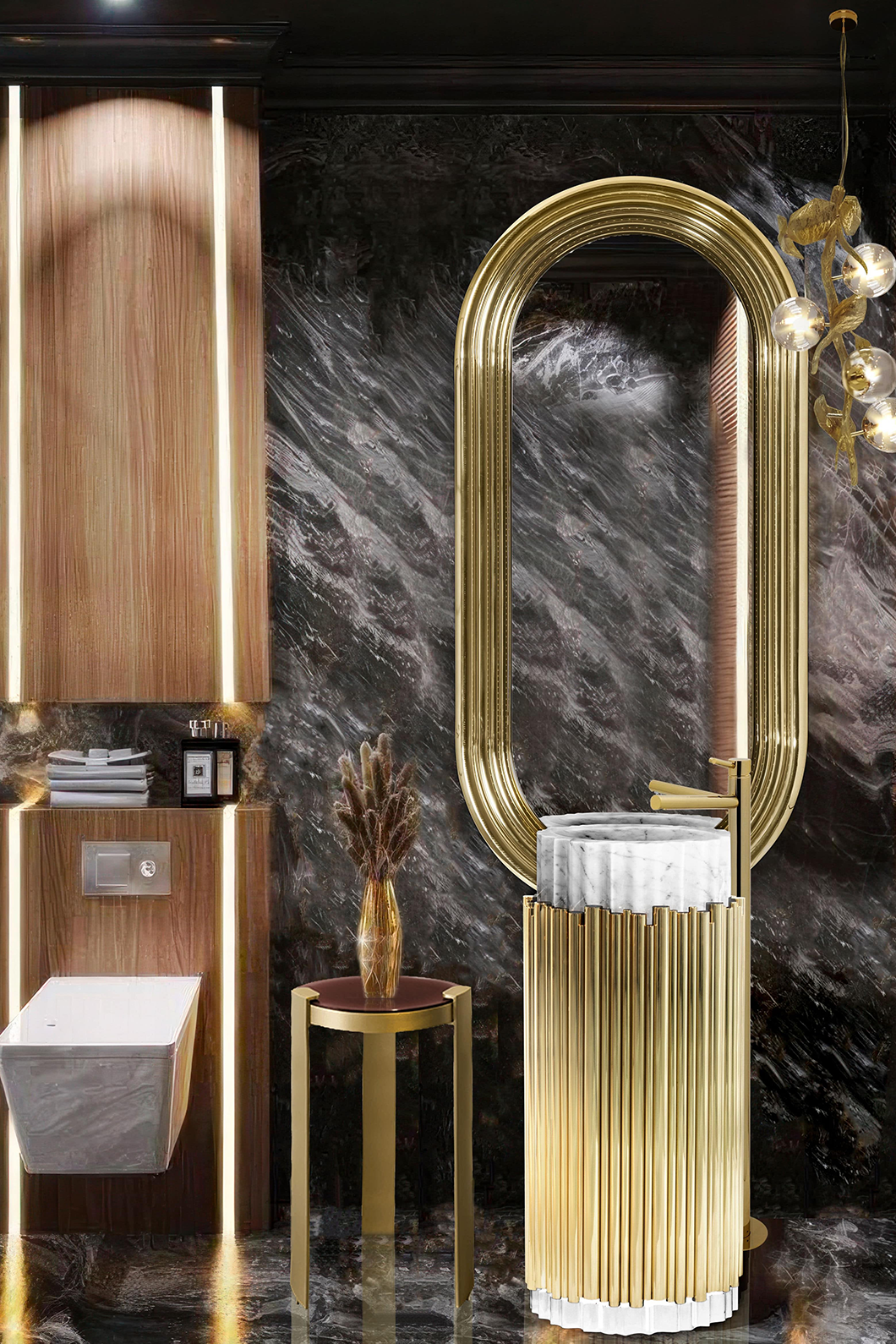 The Symphony Pedestal Sink by Maison Valentina draws inspiration from church organ tubes, as well as the curves of a violin. This modern freestanding is handmade by experienced craftsmen with different specialties, from metalwork to wood carving. It features a cluster of polished brass tubes that envelopes an exotic wood structure, bringing a lush ambiance to your bathroom set.