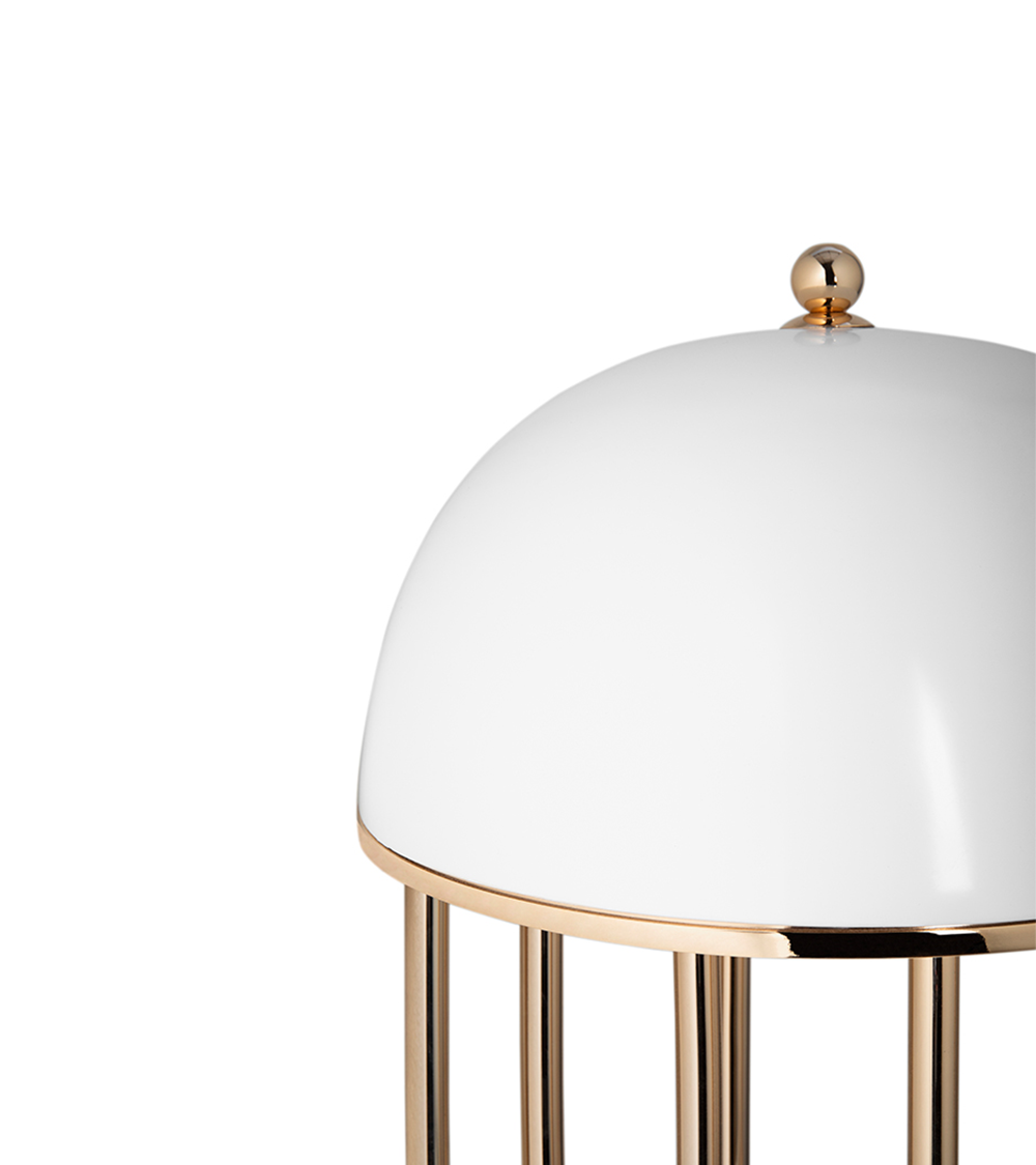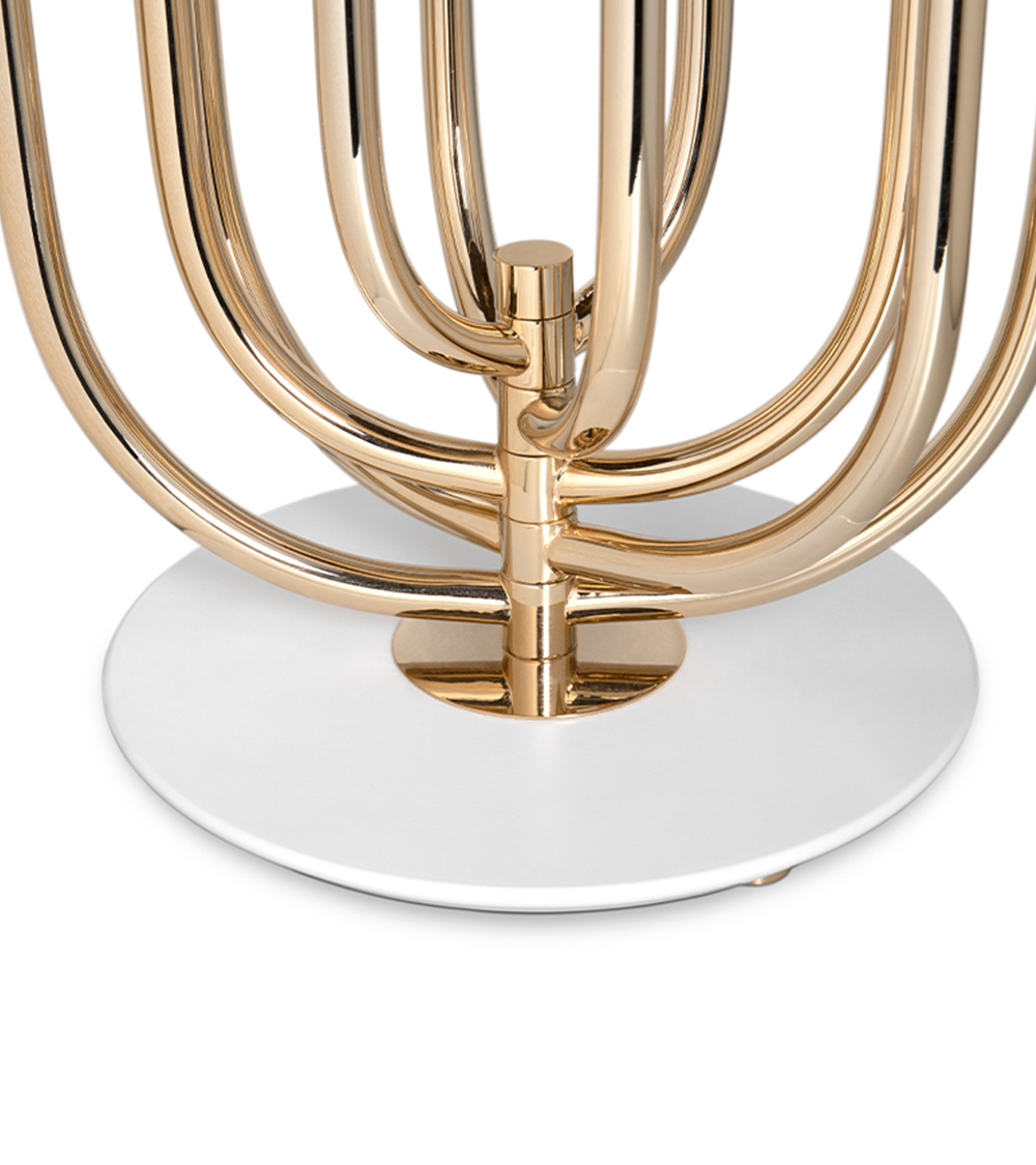 Turner art deco table lamp was inspired by the electrifying and memorable dance moves of the iconic pop singer. Turner by DelightFULL is a large table lamp handmade in brass and aluminum. The body has a gold plated finish, while the shade was lacquered a black matte on the outside and a gold powder paint on the inside, so as not to create an uncomfortable glaze for the user. Its five movable arcs can be rotated into the desired position, which gives this black table lamp a sense of fun, and allows you to create the best composition to fit your modern home decor. A versatile piece, that can be used in almost any room of your house, this brass desk lamp looks its best when placed in a modern home office or art deco inspired living room.