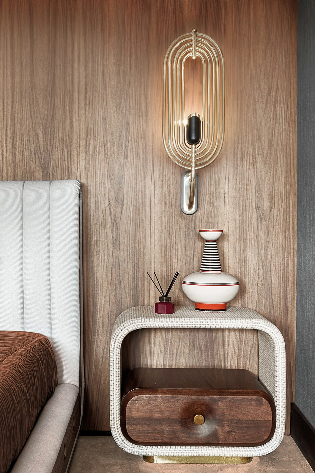 Turner is the perfect vintage addition to the Heritage Collection of DelightFULL. With 5 oval arcs made in brass, this vintage wall light was inspired by Tina Turner’s electrifying dance moves. Turner wall light features a small lamp shade made in aluminum lacquered a matte white. Its structure is 100% handmade in brass with a gold plated finish, adding an elegant and sophisticated touch to this unique wall sconce lighting. For this interior wall light, we advise you to use a E27 bulb. This art deco wall lamp suits flawlessly above a mid-century modern sideboard or as an entrance lighting.
