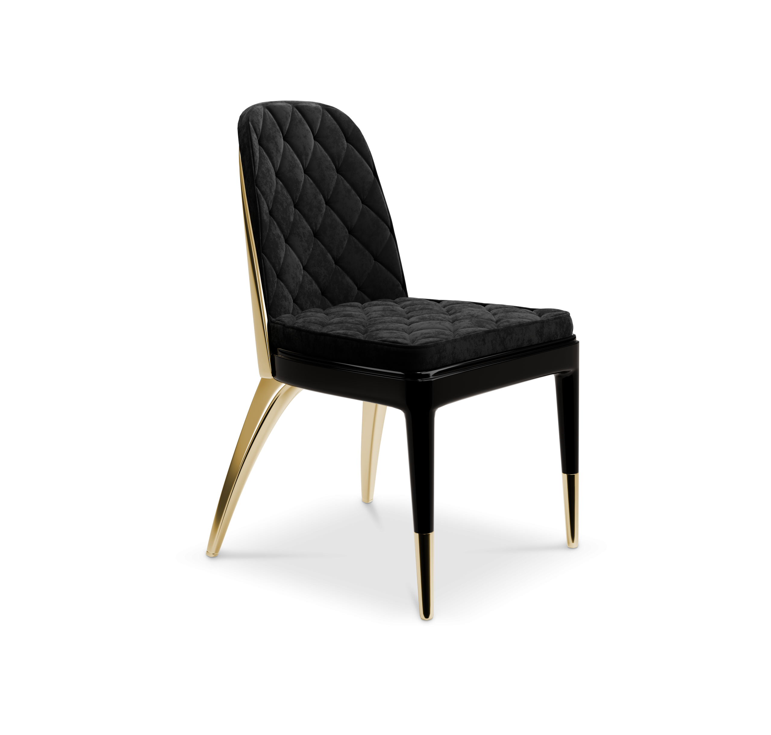 The Charla Gold Dining Chair stands as a highlight of the collection. Its polished brass frame radiates subtle opulence, while the velvet-upholstered seat balances comfort with a commanding presence, making it a sculptural element at any table.