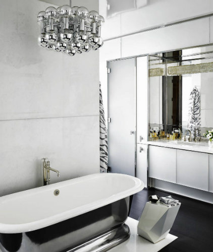 How stunning is this metallic chandelier? A contemporary design decor piece for the bathroom design.
